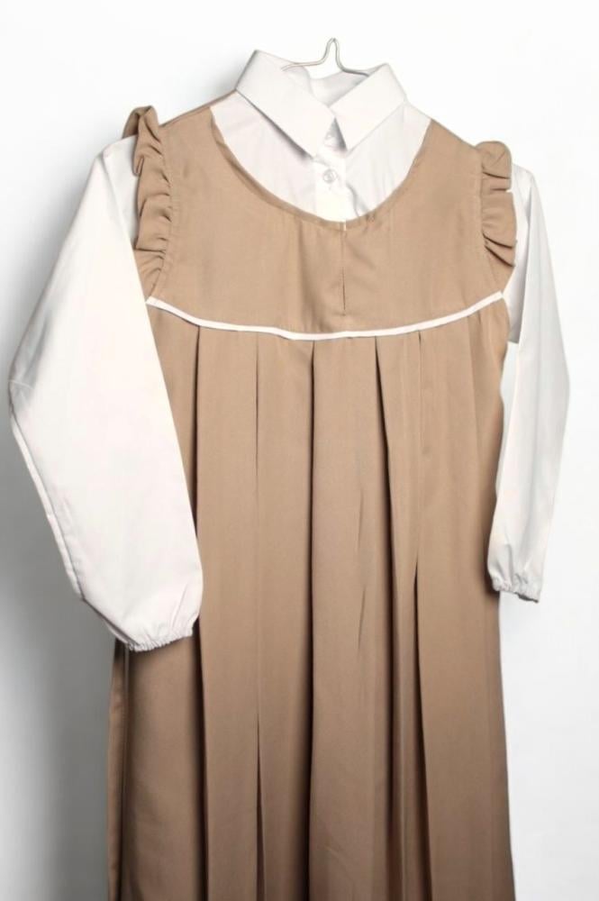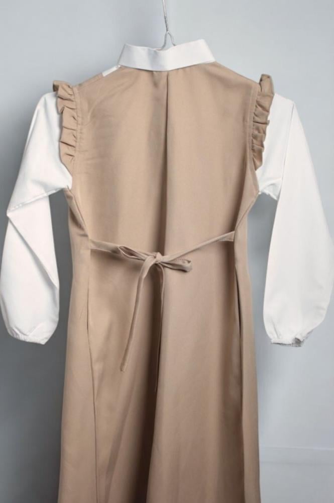 مريول بيج أنيق بلمسة ناعمة، مزين بكشكشة على الأكتاف وخط أبيض بسيط يبرز التصميم، مع قميص أبيض بياقة كلاسيكية وأكمام طويلة، مثالي لإطلالة مدرسية مرتبة ومريحة.